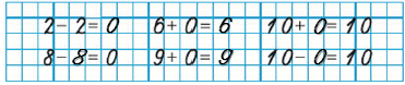 ![]() | 0 + 2 = 2 0 + 3 = 0 + 6 = 0 + 8 = | 2 - 0 = 3 - 0 = 6 - 0 = 8 - 0 = |