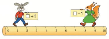 Белочка начала движение с числа 9. Она идёт влево, потому что у неё на табличке знак -. Она делает 1 шаг влево и останавливается на числе 8.