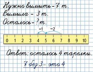 Маше нужно помыть 7 тарелок. Она уже вымыла 3 тарелки. Сколько тарелок осталось помыть?
