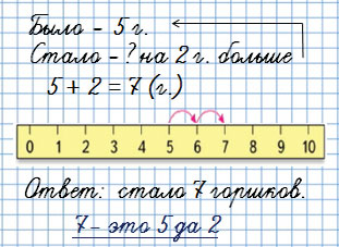 2. На окне стояло 5 горшков с цветами. Потом их стало на 2 больше. Сколько горшков с цветами теперь на окне?