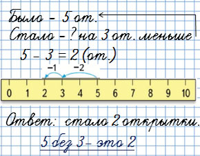 3. У Жени было 5 новогодних открыток. После Нового года у него стало на 3 открытки меньше. Сколько открыток теперь у Жени?