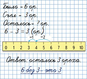 Сколько осталось? Съел, значит, убрали. Уменьшилось. Вычитание. Знак минус.