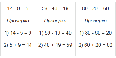 Вычитание можно проверить вычитанием. Для проверки из уменьшаемого вычитают разность. Тогда должно получиться вычитаемое. Если вычитаемое не получится, то в вычислениях допущена ошибка.