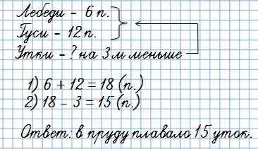 29. В пруду зоопарка плавали 6 лебедей, 12 гусей, а уток на 3 меньше, чем лебедей и гусей вместе. Сколько уток плавало в пруду?