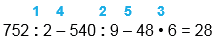 | 752 : 2 - 540 : 9 - 48 • 6 = 28 | |