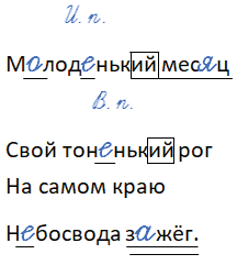 Имена прилагательные (молоденький, тоненький) имеют одинаковые окончания, но при этом стоят в разных падежах.