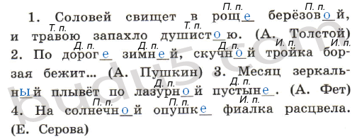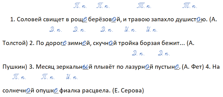 1. Соловей свищет в рощ_ берёзов_й, и травою запахло душист_ю. (А. Толстой) 2. По дорог_ зимн_й, скучн_й тройка борзая бежит... (А. Пушкин) 3. Месяц зеркальн_й плывёт по лазурн_й пустын_. (А. Фет) 4. На солнечн_й опушк_ фиалка расцвела. (Е. Серова)