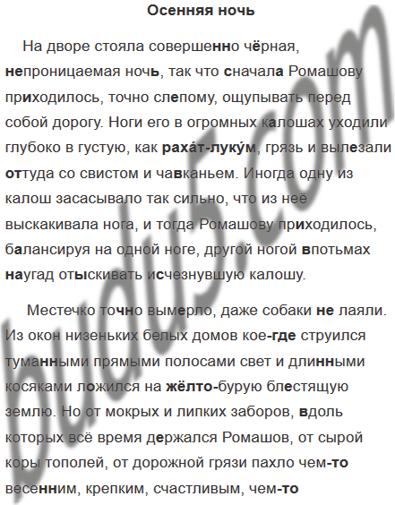 Местечко точ(?)но вым..рло, даже собаки (не) лаяли. Из окон низеньких белых домов кое (где) струился тума(н, нн)ыми прямыми полосами свет и дли(н, нн)ыми косяками л..жился на (ж..лто) бурую бл..стящую землю. Но от мокрых и липких заборов, (в) доль которых всё время д..ржался Ромашов, от сырой коры тополей, от дорожной грязи пахло чем (то) весе(н, нн)им, крепким, счастливым, чем (то) бе(с, сс)ознательно и весело раздр..жаю-щим. Даже сильный ветер, стр..мительно носивш..йся по улицам, дул (по) весе(н, нн)ему (не) ровно, прерыв..сто, точно вздраг..вая, путаясь и шаля. (А. Куприн)
