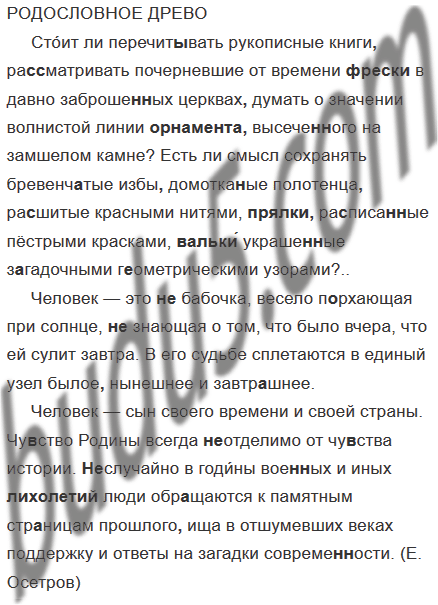 Человек — сын своего времени и своей страны. Чу(?)ство Родины всегда (не) отделимо от чу(?)ства истории. (Не) случайно в годи́ны вое(н, нн)ых и иных лихолетий люди обр..щаются к памятным стр..ницам прошлого ища в отшумевших веках поддержку и ответы на загадки совреме(н, нн)ости. (Е. Осетров)