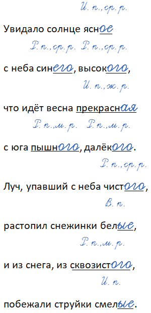 - Укажите падеж и род у имён прилагательных в единственном числе и падеж у имён прилагательных во множественном числе.