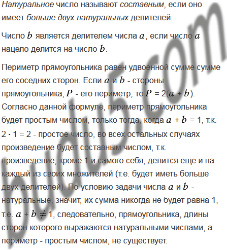 Существует ли прямоугольник, длины сторон которого выражаются натуральными числами, а периметр - простым числом (длины сторон и периметр прямоугольника выражены в одних и тех же единицах измерения)? Ответ обоснуйте.