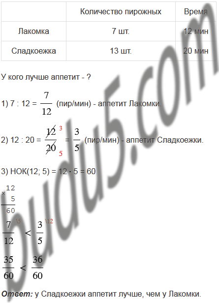 Лакомка съедает 7 пирожных за 12 мин, а Сладкоежка - 13 пирожных за 20 мин. У кого аппетит лучше - у Лакомки или у Сладкоежки?