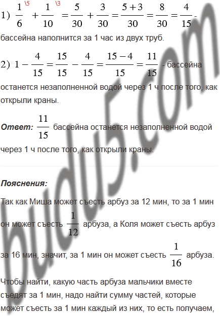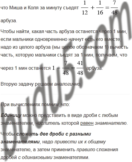 1) Миша может съесть арбуз за 12 мин, а Коля - за 16 мин. Какая часть арбуза останется через 1 мин, если мальчики одновременно начнут есть его вместе?