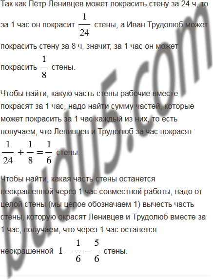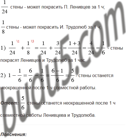Пётр Ленивцев может покрасить стену за 24 ч, а Иван Трудолюб - за 8 ч. Какая часть стены останется неокрашенной после 1 ч совместной работы Ленивцева и Трудолюба?