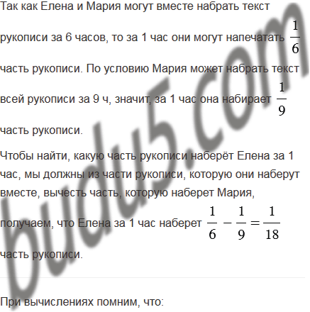 Елена и Мария могут вместе набрать текст рукописи за 6 ч. Какую часть рукописи наберёт Елена за 1 ч, если Мария может набрать текст всей рукописи за 9 ч?