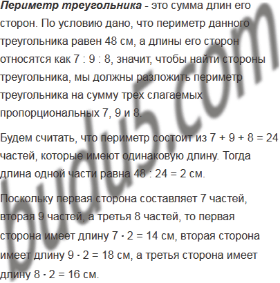 Периметр треугольника равен 48 см, а длины его сторон относятся как 7 : 9 : 8. Найдите стороны треугольника.