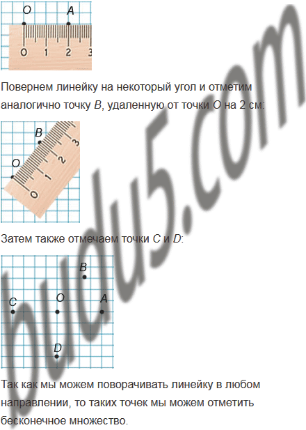 Отметьте на плоскости произвольную точку О. Отметьте четыре точки, удалённые от точки О на 2 см. Сколько ещё можно отметить таких точек?