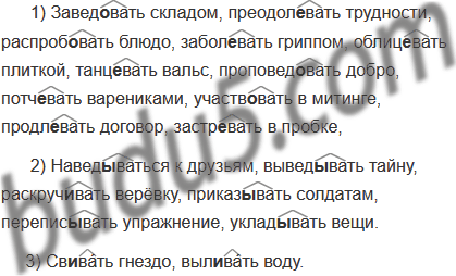 Навед..ваться к друзьям, завед..вать складом, преодол..вать трудности, св..вать гнездо, распроб..вать блюдо, вывед..вать тайну, забол..вать гриппом, облиц..вать плиткой, размаз..вать краску, застр..вать в пробке, танц..вать вальс, проповед..вать добро, раскруч..вать верёвку, потч..вать варениками, участв..вать в митинге, продл..вать договор, приказ..вать солдатам, перепис..вать упражнение, выл..вать воду, уклад..вать вещи.