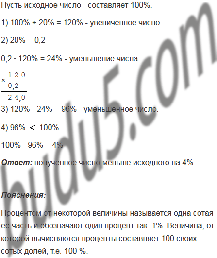 Некоторое число сначала увеличили на 20%, а потом уменьшили результат на 20%. Установите, больше или меньше исходного полученное число и на сколько процентов.