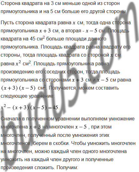Сторона квадрата на 3 см меньше одной из сторон прямоугольника и на 5 см больше его другой стороны. Найдите сторону квадрата, если его площадь на 45 см2 больше площади данного прямоугольника.