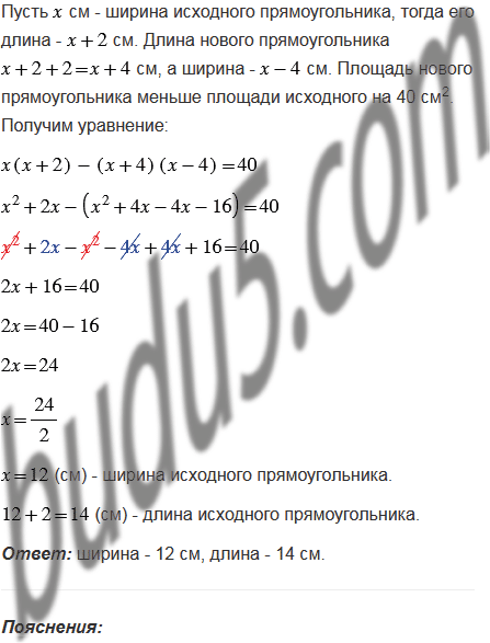 Длина прямоугольника на 2 см больше его ширины. Если длину увеличить на 2 см, а ширину уменьшить на 4 см, то площадь прямоугольника уменьшится на 40 см2. Найдите исходные длину и ширину прямоугольника.
