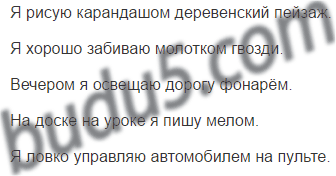 Рисую, карандаш; забиваю, молоток; освещаю, фонарь; пишу, мел; управляю, автомобиль.