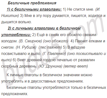 1) Не спится мне. (И. Никитин) 2) Ещё в сенях его обожгло свежим холодом. (В. Смирнов) 3) Мне в эту пору думается, пишется, ходится и дышится вольно. 4) Пахнет ёлками и снегом. (Н. Рубцов) 5) В воздухе посвистывало и выло. (Г. Павленко) 6) Веет древней гордою печалью от развалин скорбных деревень. (Ю. Друнина)