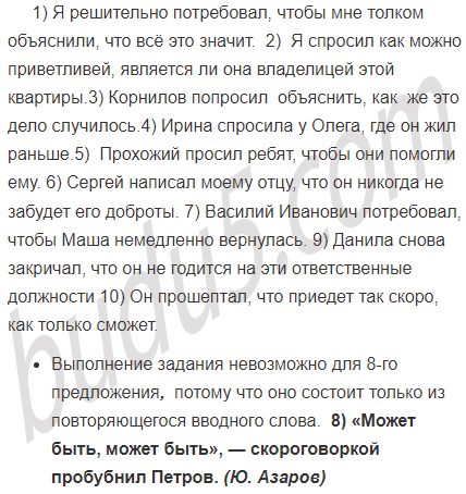 1) «Тогда объясните мне толком, что всё это значит!» — вдруг решительно потребовал я. (В. Астафьев) 2) «Значит, вы являетесь владелицей этой квартиры?» — спросил я как можно приветливей. (А. Волос) 3) «Так как же это дело случилось, расскажите, Семён Лукич», — попросил Корнилов. (Ю. Домбровский) 4) «А где вы раньше жили?» — спросила Ирина у Олега. (И. Ефремов) 5) «Ребята, помогите мне, пожалуйста!» — просил прохожий. (Г. Андреев) 6) Сергей написал моему отцу: «Я никогда не забуду Вашей доброты!» (О. Павлов) 7) «Маша, а ну-ка немедленно вернись!» — потребовал Василий Иванович. (Г. Андреев) 8) «Может быть, может быть», — скороговоркой пробубнил Петров. (Ю. Азаров) 9) «Не гожусь я на эти ответственные должности!» — снова закричал Данила. (В. Астафьев) 10) «Я приеду так скоро, как только смогу», — прошептал он. (А. Алексин)