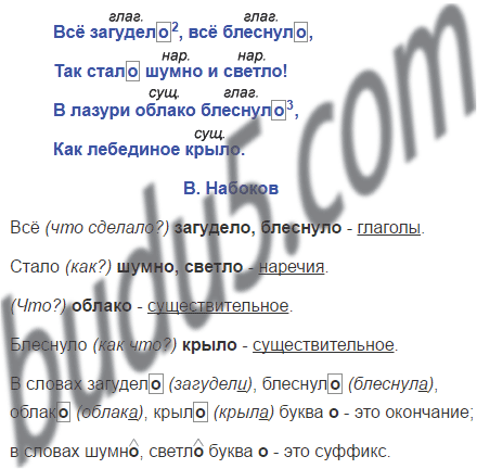 Не забудь разобрать по составу слово загудело2 (помни, что суффикс -л- не входит в основу слова), а глагол блеснуло3 как часть речи.