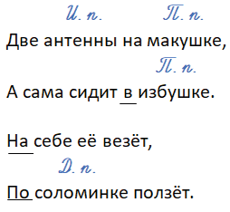 Антенны (на чем?) на макушке (П. п.), сидит (в чем?) в избушке (П. п.).
